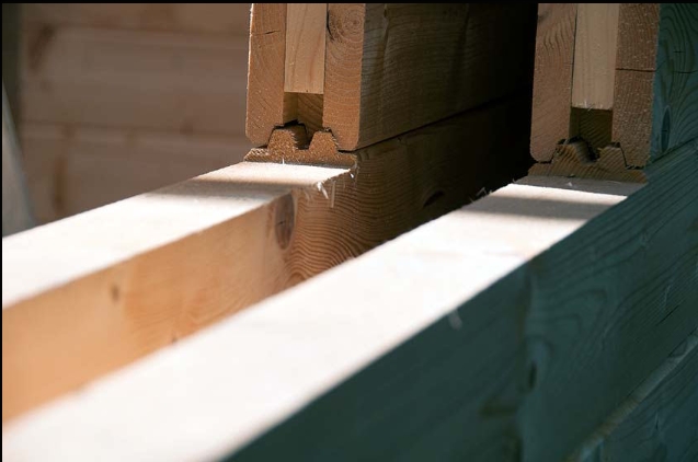Dubbelwandig houtstapelbouw. Tussen de 2 wanden komt het isolatiemateriaal en het leidingwerk.